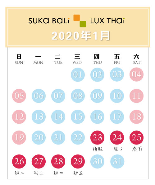 2020 的春節共有 1/23(小年夜)~1/29(初五)