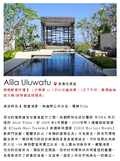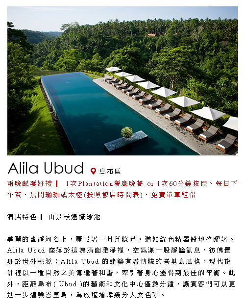 例如: Alila Ubud 2晚 + Alila Uluwatu 2晚