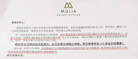 大氣奢華的裝潢風格,及多樣的餐食服務,寬敞的飯店空間, 都是為許多客人津津樂道的話題。 而 Mulia 也相當豪氣的,在飯店房間內使用相當頂級的臥室及衛浴用品, 讓每一個選擇 Mulia 的貴賓,都能夠有個非常不一樣的住房體驗。 所以在 check in Mulia 時,每組客人都會收到以下的提醒。 |