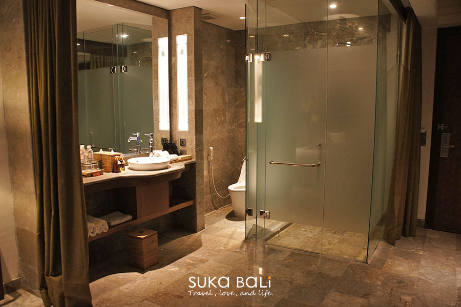 小編入住的是基本房型Deluxe Room,坪數高達50平方米! 看看床附近空下來的感空間夠小編在房間內自我鍛鍊好幾組了! 浴室跟臥室是用簾幕來隔間,沒有拉開簾幕的情況下看起來更寬敞了。大理石地板 & 牆壁上草蓆剪影畫作裝飾也是房間的設計特色之一。